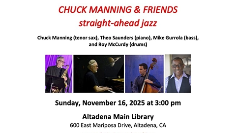 Altadena Library 600 East Mariposa Street, AltadenaMt Lowe Chamber Players Straight-head Jazz Chuck Manning (tenor sax), Theo Saunders (piano), Mike Gurrola (bass), and Roy McCurdy (drums) Straight-ahead jazz is the point of departure these long-time veterans of the Los Angeles jazz scene but creating a temporal … Read More